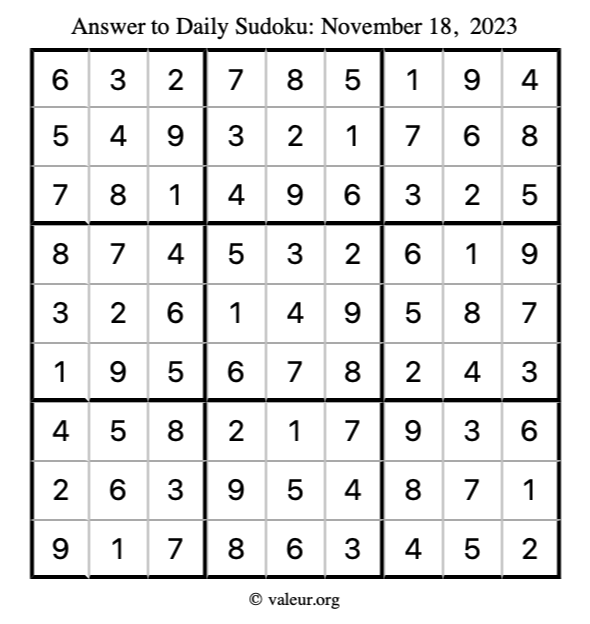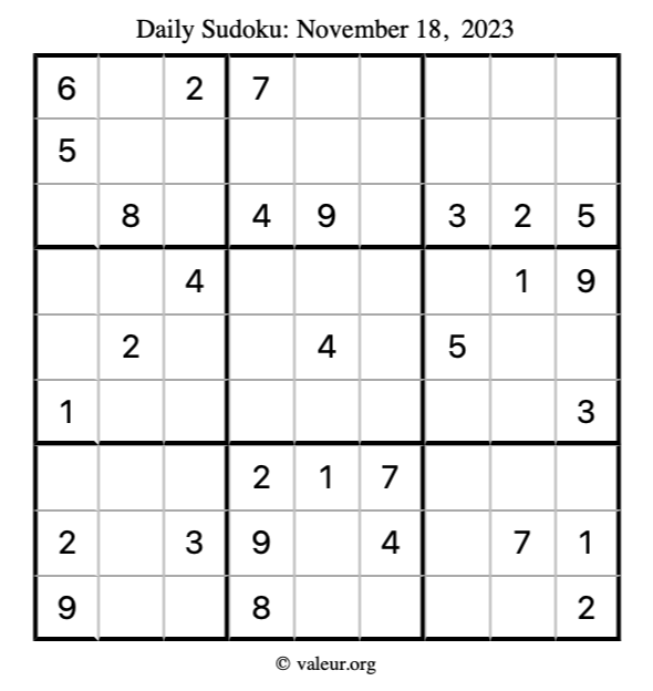 Here is the November 18, 2023 sudoku puzzle. You are welcome to print a copy to solve by hand. For your convenience, we have also included the solution further down the page so you can check your work.