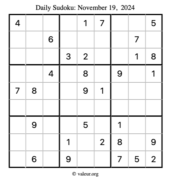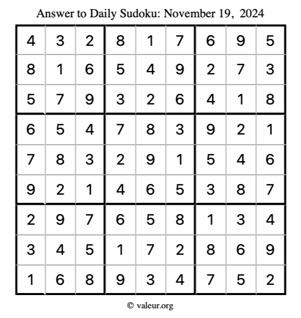 Here is the November 19, 2024 sudoku puzzle. You are welcome to print a copy to solve by hand. For your convenience, we have also included the solution further down the page so you can check your work.