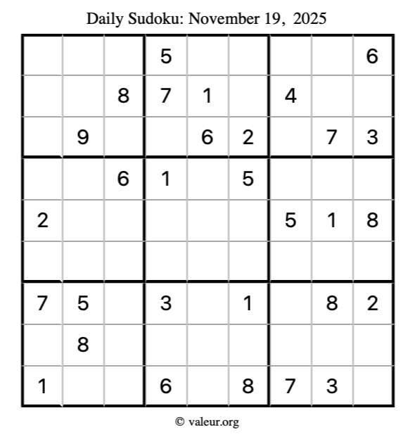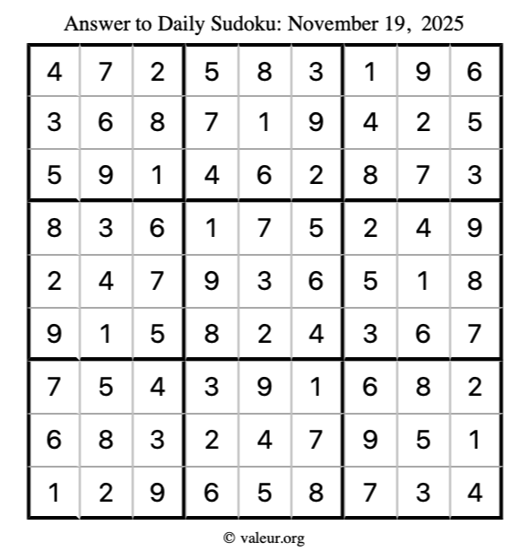 Here is the November 19, 2025 sudoku puzzle. You are welcome to print a copy to solve by hand. For your convenience, we have also included the solution further down the page so you can check your work.