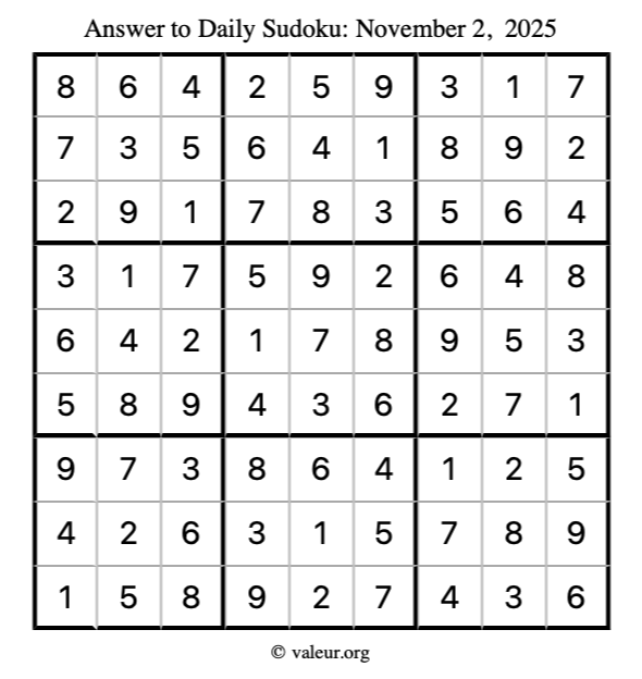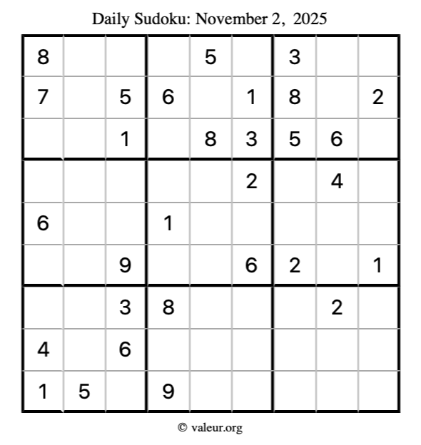 Here is the November 2, 2025 sudoku puzzle. You are welcome to print a copy to solve by hand. For your convenience, we have also included the solution further down the page so you can check your work.