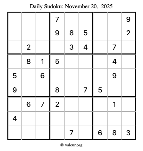 Here is the November 20, 2025 sudoku puzzle. You are welcome to print a copy to solve by hand. For your convenience, we have also included the solution further down the page so you can check your work.
