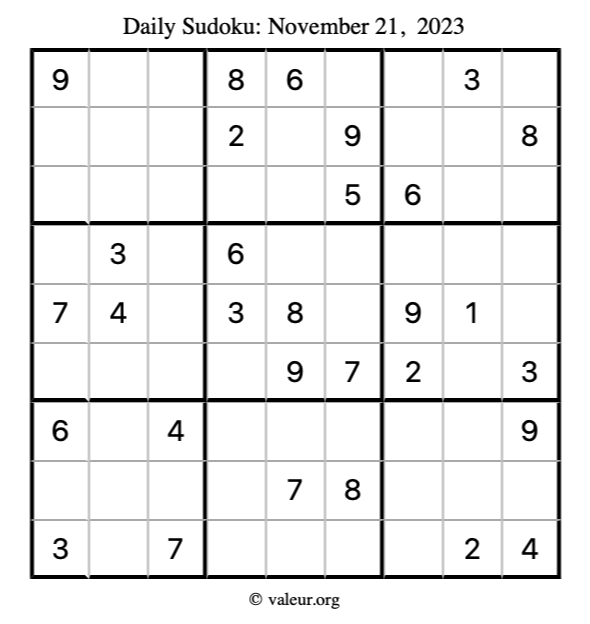 Here is the November 21, 2023 sudoku puzzle. You are welcome to print a copy to solve by hand. For your convenience, we have also included the solution further down the page so you can check your work.