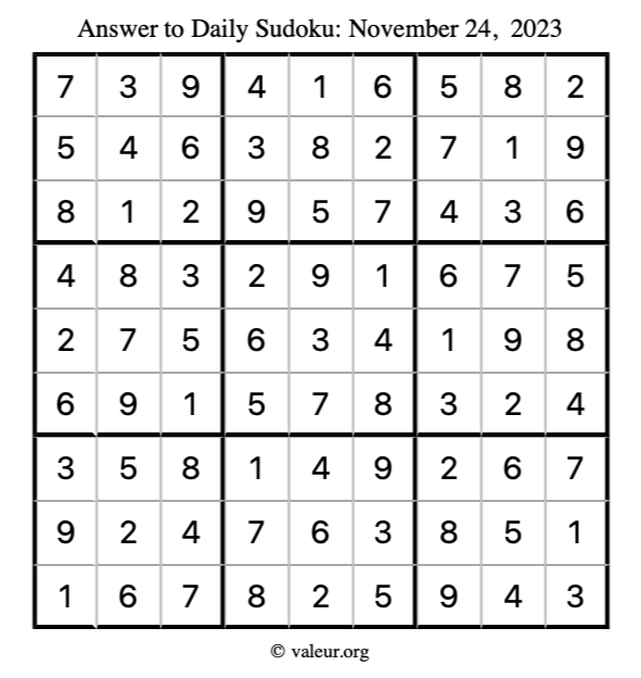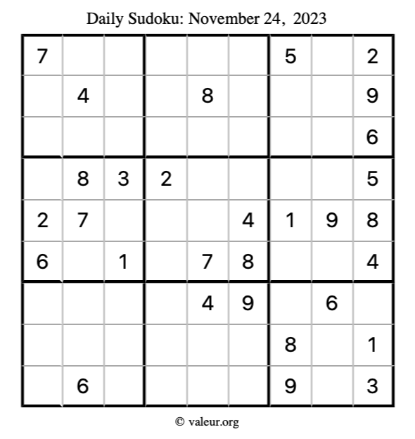 Here is the November 24, 2023 sudoku puzzle. You are welcome to print a copy to solve by hand. For your convenience, we have also included the solution further down the page so you can check your work.