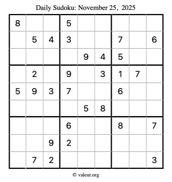Here is the November 25, 2025 sudoku puzzle. You are welcome to print a copy to solve by hand. For your convenience, we have also included the solution further down the page so you can check your work.