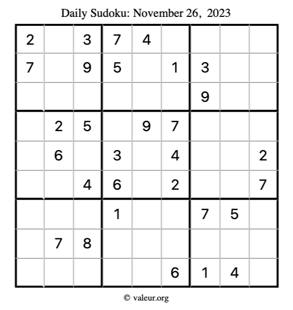 Here is the November 26, 2023 sudoku puzzle. You are welcome to print a copy to solve by hand. For your convenience, we have also included the solution further down the page so you can check your work.