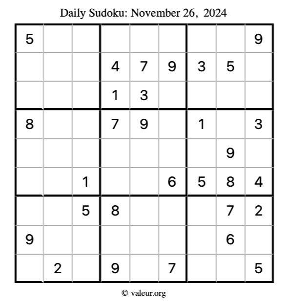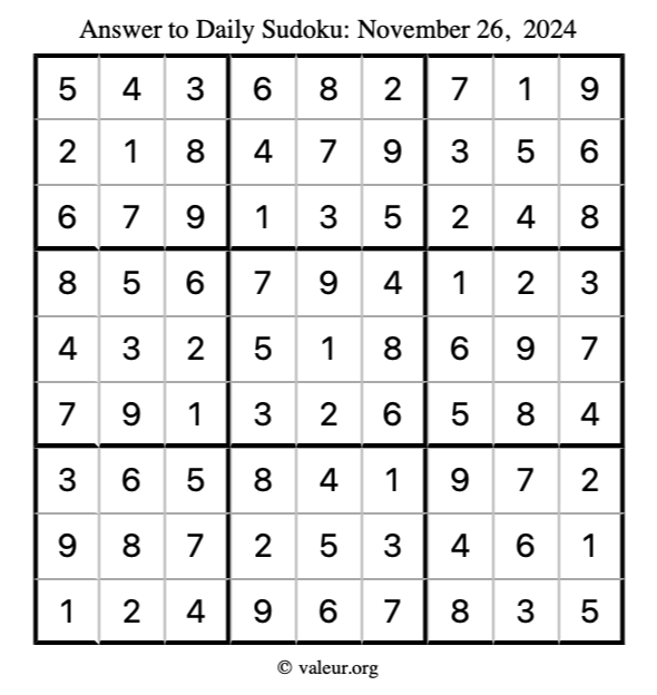 Here is the November 26, 2024 sudoku puzzle. You are welcome to print a copy to solve by hand. For your convenience, we have also included the solution further down the page so you can check your work.