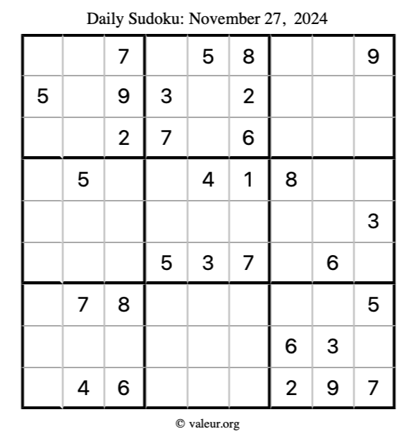 Here is the November 27, 2024 sudoku puzzle. You are welcome to print a copy to solve by hand. For your convenience, we have also included the solution further down the page so you can check your work.