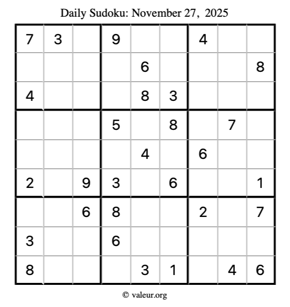 Here is the November 27, 2025 sudoku puzzle. You are welcome to print a copy to solve by hand. For your convenience, we have also included the solution further down the page so you can check your work.