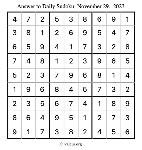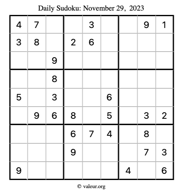 Here is the November 29, 2023 sudoku puzzle. You are welcome to print a copy to solve by hand. For your convenience, we have also included the solution further down the page so you can check your work.