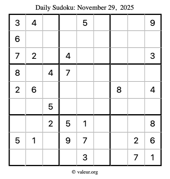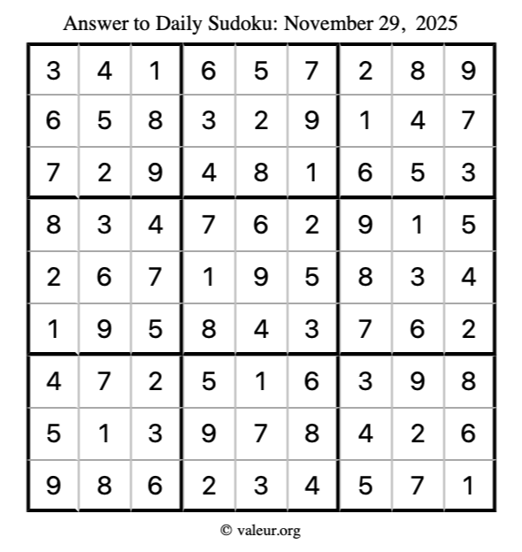 Here is the November 29, 2025 sudoku puzzle. You are welcome to print a copy to solve by hand. For your convenience, we have also included the solution further down the page so you can check your work.
