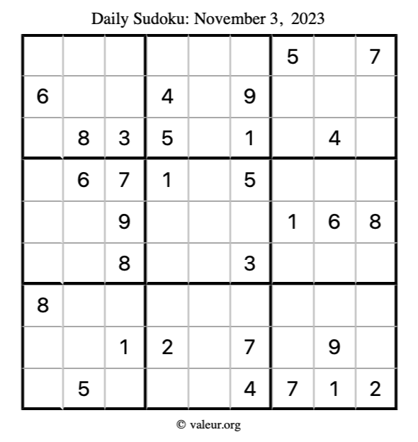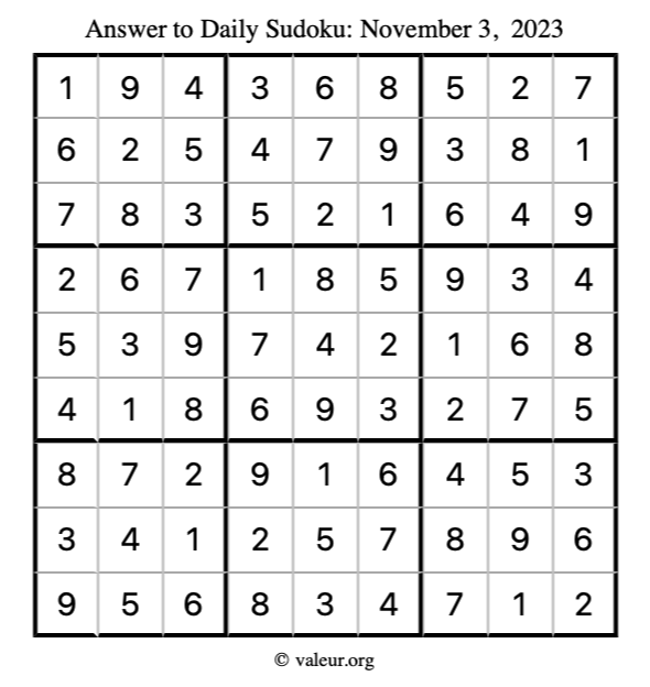 Here is the November 3, 2023 sudoku puzzle. You are welcome to print a copy to solve by hand. For your convenience, we have also included the solution further down the page so you can check your work.