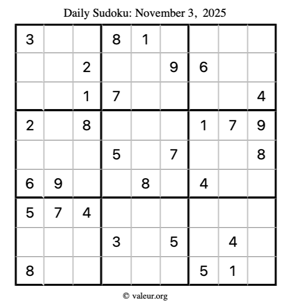 Here is the November 3, 2025 sudoku puzzle. You are welcome to print a copy to solve by hand. For your convenience, we have also included the solution further down the page so you can check your work.