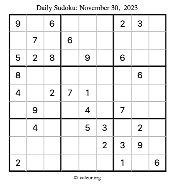 Here is the November 30, 2023 sudoku puzzle. You are welcome to print a copy to solve by hand. For your convenience, we have also included the solution further down the page so you can check your work.
