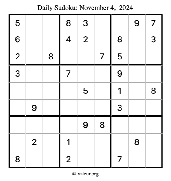 Here is the November 4, 2024 sudoku puzzle. You are welcome to print a copy to solve by hand. For your convenience, we have also included the solution further down the page so you can check your work.