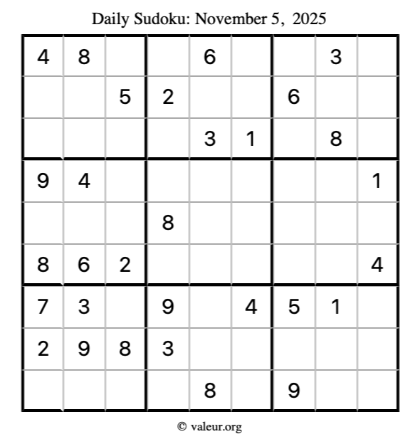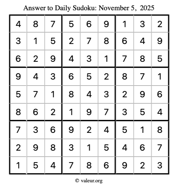 Here is the November 5, 2025 sudoku puzzle. You are welcome to print a copy to solve by hand. For your convenience, we have also included the solution further down the page so you can check your work.