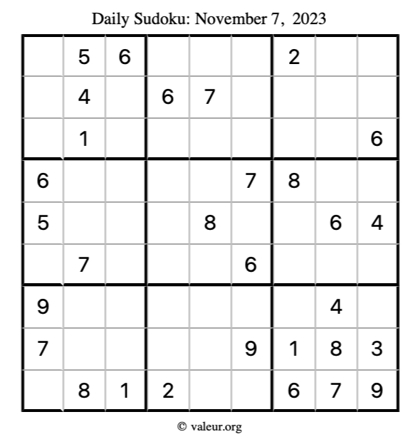 Here is the November 7, 2023 sudoku puzzle. You are welcome to print a copy to solve by hand. For your convenience, we have also included the solution further down the page so you can check your work.