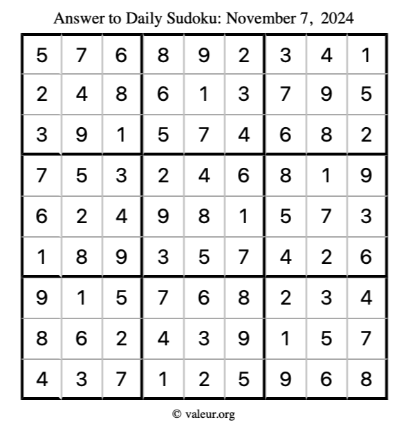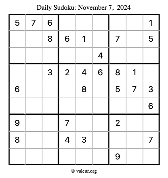 Here is the November 7, 2024 sudoku puzzle. You are welcome to print a copy to solve by hand. For your convenience, we have also included the solution further down the page so you can check your work.