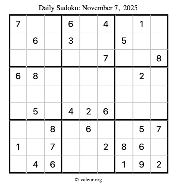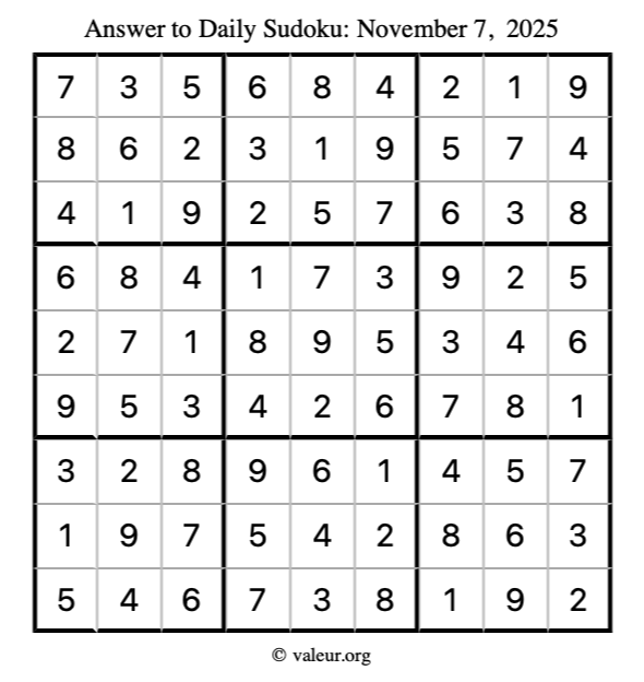 Here is the November 7, 2025 sudoku puzzle. You are welcome to print a copy to solve by hand. For your convenience, we have also included the solution further down the page so you can check your work.