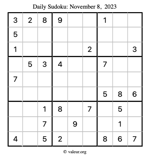 Here is the November 8, 2023 sudoku puzzle. You are welcome to print a copy to solve by hand. For your convenience, we have also included the solution further down the page so you can check your work.