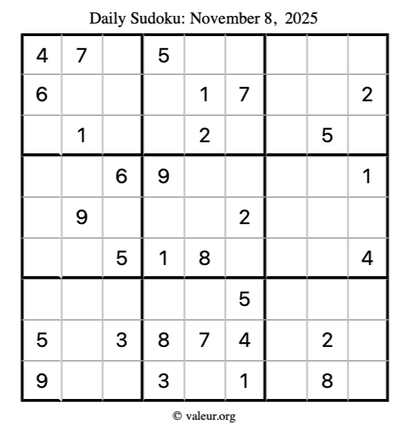 Here is the November 8, 2025 sudoku puzzle. You are welcome to print a copy to solve by hand. For your convenience, we have also included the solution further down the page so you can check your work.