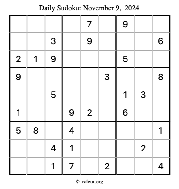Here is the November 9, 2024 sudoku puzzle. You are welcome to print a copy to solve by hand. For your convenience, we have also included the solution further down the page so you can check your work.