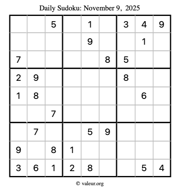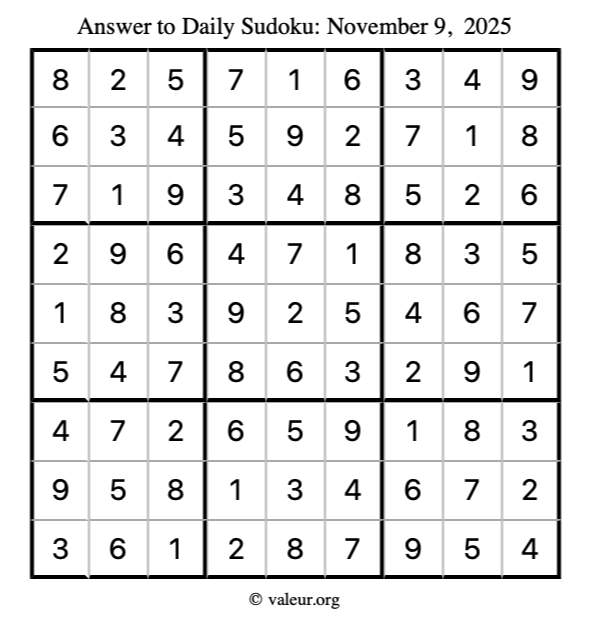 Here is the November 9, 2025 sudoku puzzle. You are welcome to print a copy to solve by hand. For your convenience, we have also included the solution further down the page so you can check your work.