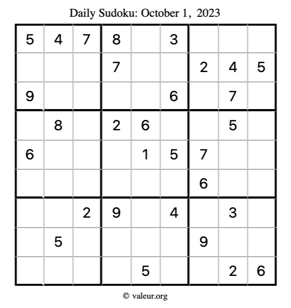 Here is the October 1, 2023 sudoku puzzle. You are welcome to print a copy to solve by hand. For your convenience, we have also included the solution further down the page so you can check your work.