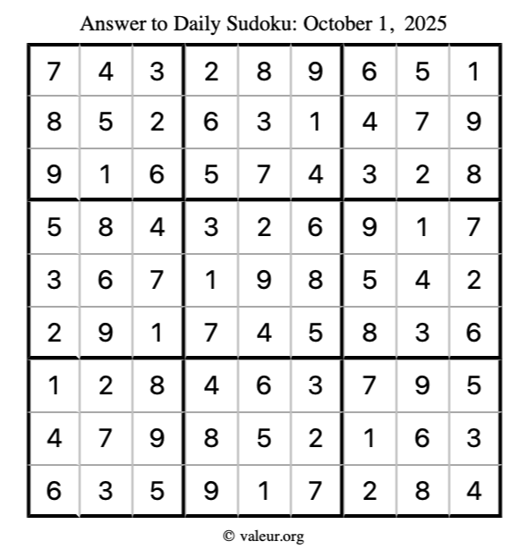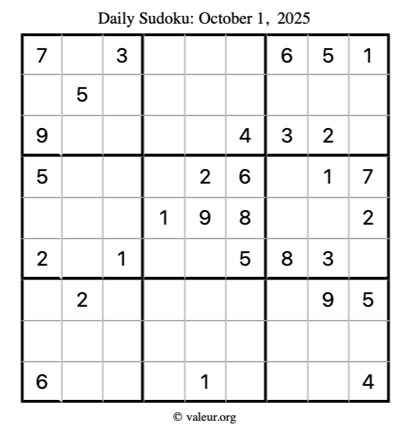 Here is the October 1, 2025 sudoku puzzle. You are welcome to print a copy to solve by hand. For your convenience, we have also included the solution further down the page so you can check your work.