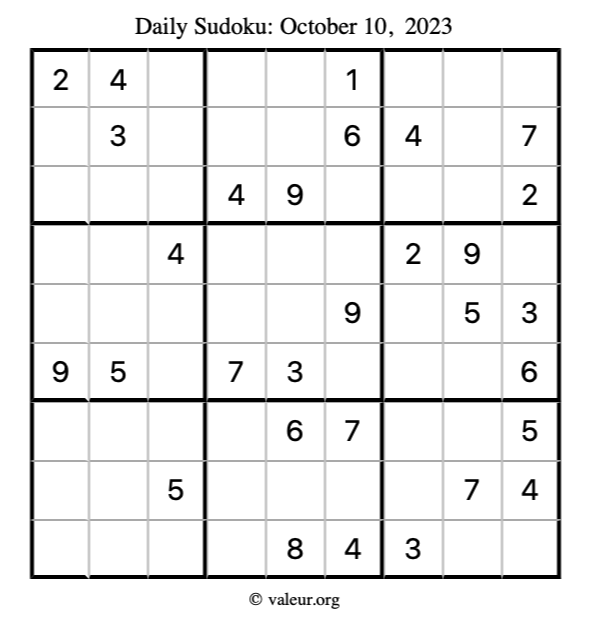 Here is the October 10, 2023 sudoku puzzle. You are welcome to print a copy to solve by hand. For your convenience, we have also included the solution further down the page so you can check your work.