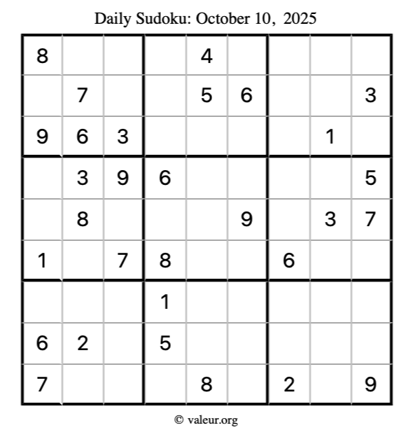 Here is the October 10, 2025 sudoku puzzle. You are welcome to print a copy to solve by hand. For your convenience, we have also included the solution further down the page so you can check your work.