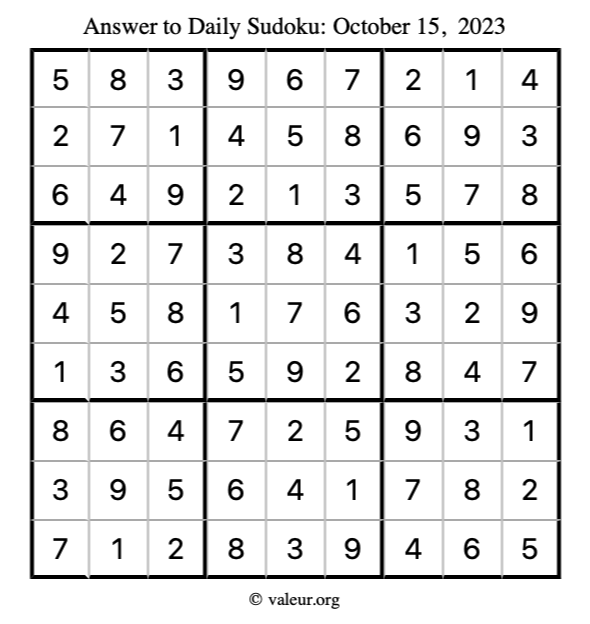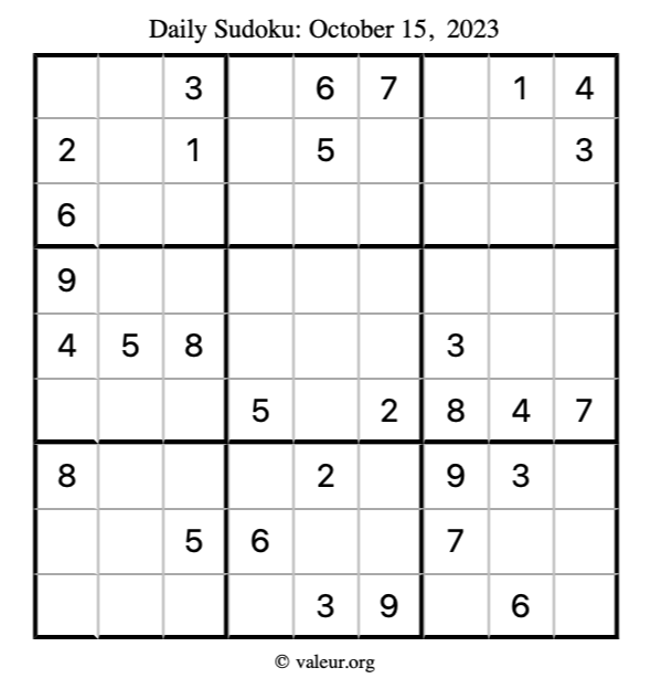 Here is the October 15, 2023 sudoku puzzle. You are welcome to print a copy to solve by hand. For your convenience, we have also included the solution further down the page so you can check your work.