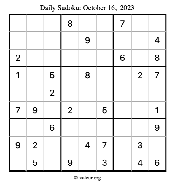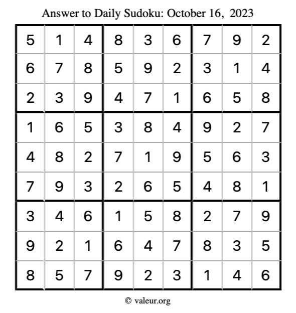 Here is the October 16, 2023 sudoku puzzle. You are welcome to print a copy to solve by hand. For your convenience, we have also included the solution further down the page so you can check your work.