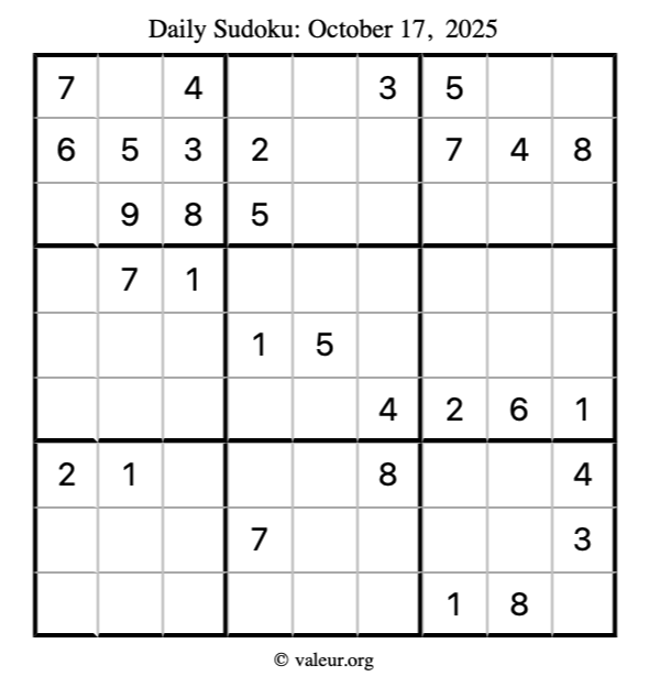 Here is the October 17, 2025 sudoku puzzle. You are welcome to print a copy to solve by hand. For your convenience, we have also included the solution further down the page so you can check your work.