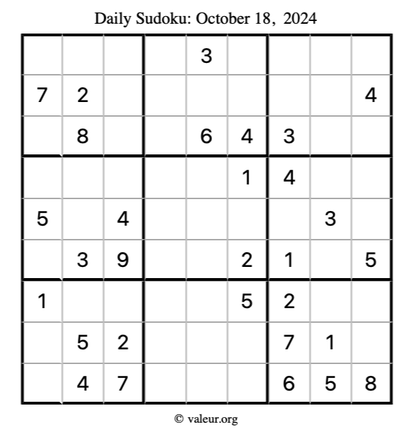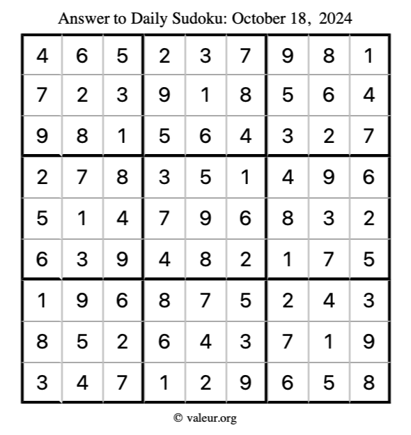 Here is the October 18, 2024 sudoku puzzle. You are welcome to print a copy to solve by hand. For your convenience, we have also included the solution further down the page so you can check your work.