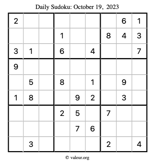 Here is the October 19, 2023 sudoku puzzle. You are welcome to print a copy to solve by hand. For your convenience, we have also included the solution further down the page so you can check your work.