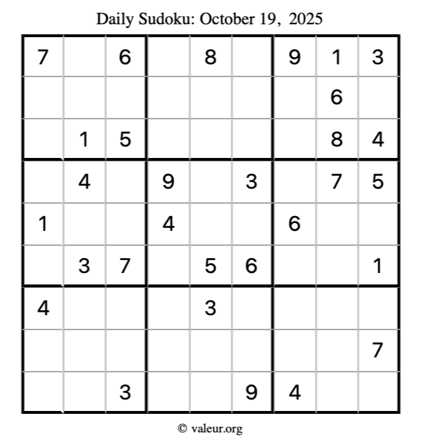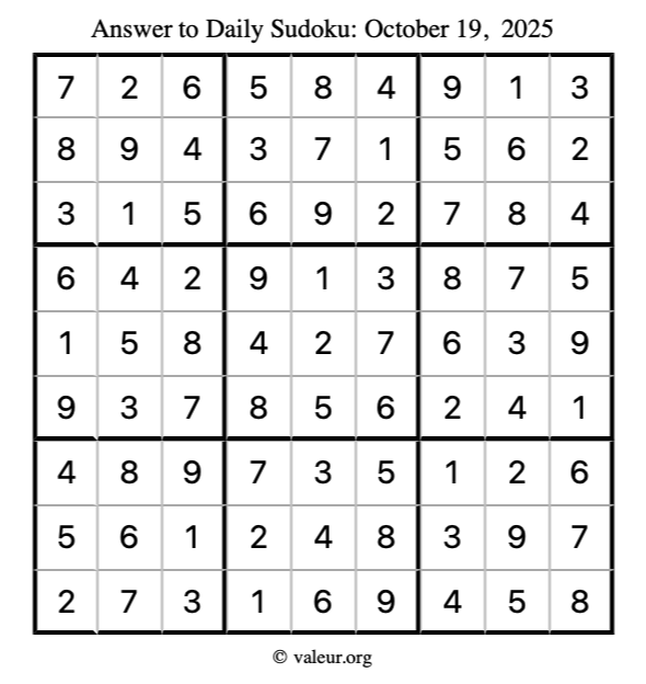 Here is the October 19, 2025 sudoku puzzle. You are welcome to print a copy to solve by hand. For your convenience, we have also included the solution further down the page so you can check your work.