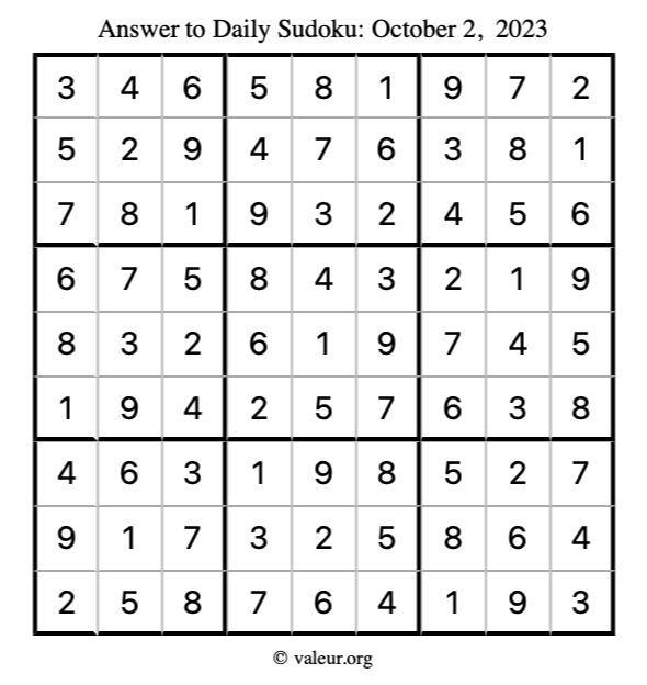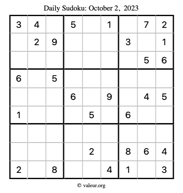 Here is the October 2, 2023 sudoku puzzle. You are welcome to print a copy to solve by hand. For your convenience, we have also included the solution further down the page so you can check your work.