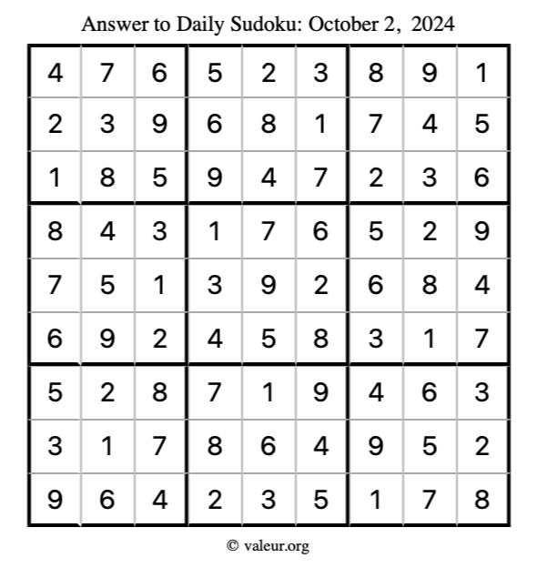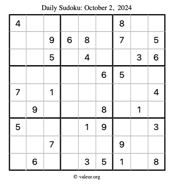 Here is the October 2, 2024 sudoku puzzle. You are welcome to print a copy to solve by hand. For your convenience, we have also included the solution further down the page so you can check your work.