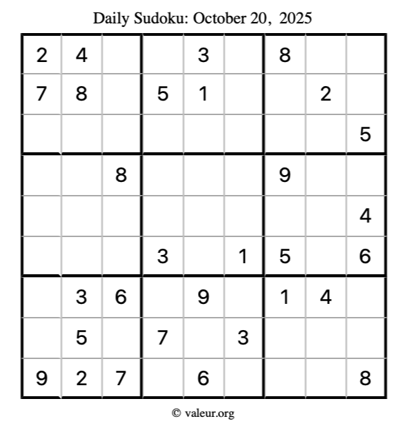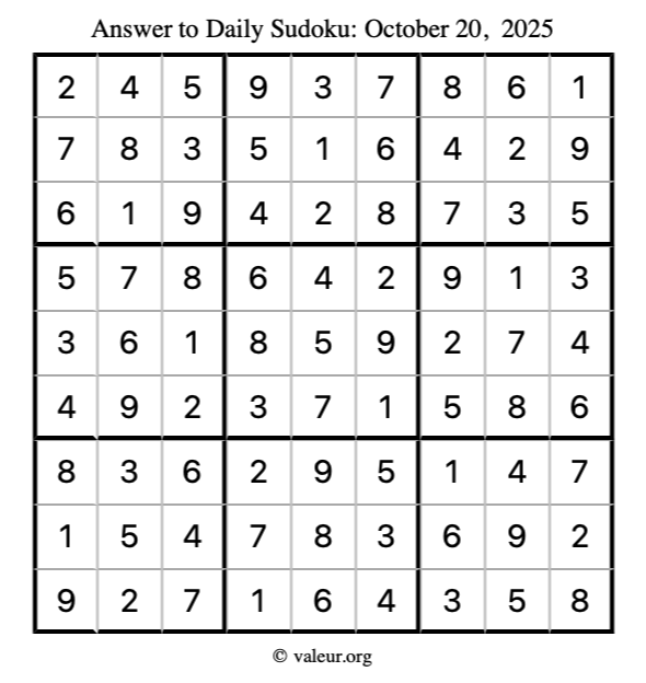 Here is the October 20, 2025 sudoku puzzle. You are welcome to print a copy to solve by hand. For your convenience, we have also included the solution further down the page so you can check your work.