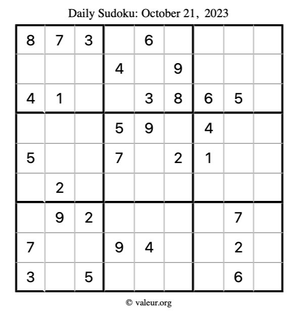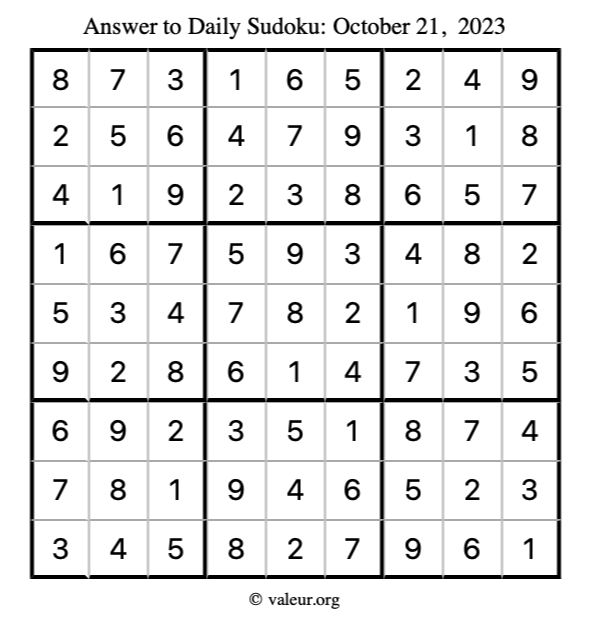 Here is the October 21, 2023 sudoku puzzle. You are welcome to print a copy to solve by hand. For your convenience, we have also included the solution further down the page so you can check your work.