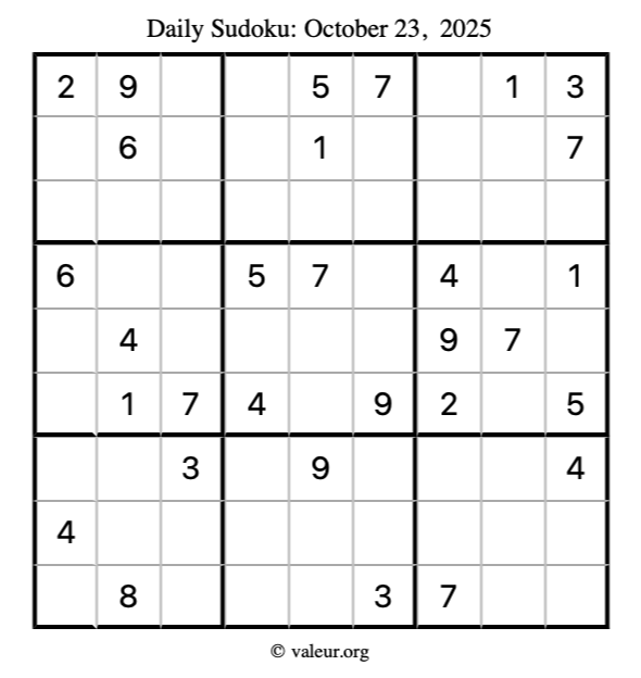 Here is the October 23, 2025 sudoku puzzle. You are welcome to print a copy to solve by hand. For your convenience, we have also included the solution further down the page so you can check your work.