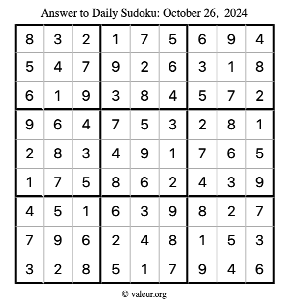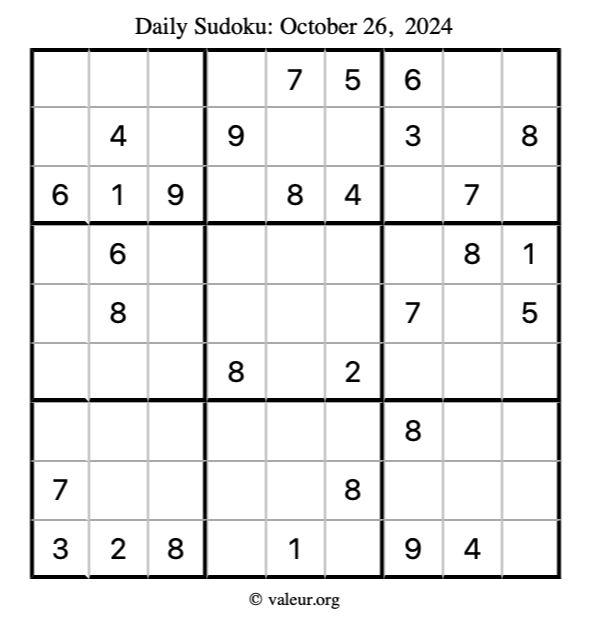 Here is the October 26, 2024 sudoku puzzle. You are welcome to print a copy to solve by hand. For your convenience, we have also included the solution further down the page so you can check your work.