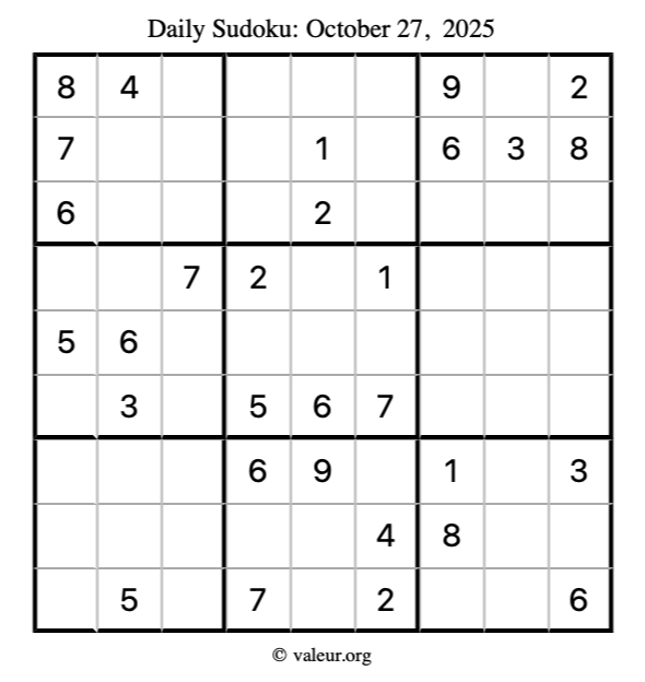 Here is the October 27, 2025 sudoku puzzle. You are welcome to print a copy to solve by hand. For your convenience, we have also included the solution further down the page so you can check your work.