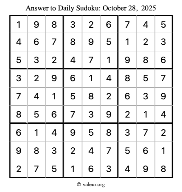 Here is the October 28, 2025 sudoku puzzle. You are welcome to print a copy to solve by hand. For your convenience, we have also included the solution further down the page so you can check your work.