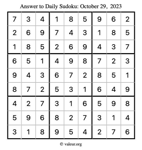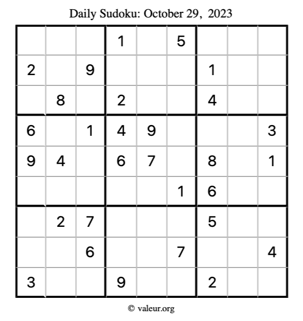 Here is the October 29, 2023 sudoku puzzle. You are welcome to print a copy to solve by hand. For your convenience, we have also included the solution further down the page so you can check your work.
