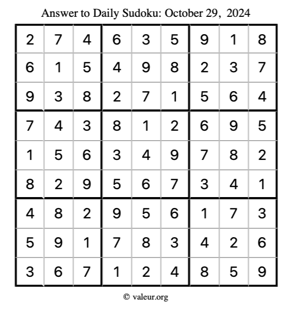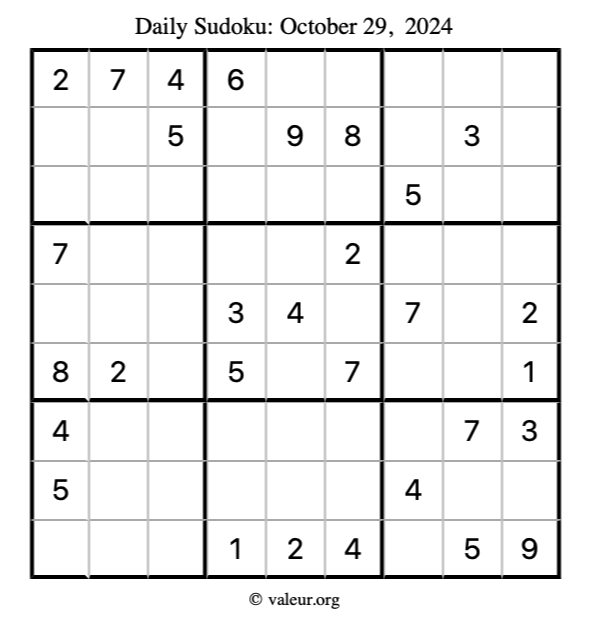 Here is the October 29, 2024 sudoku puzzle. You are welcome to print a copy to solve by hand. For your convenience, we have also included the solution further down the page so you can check your work.