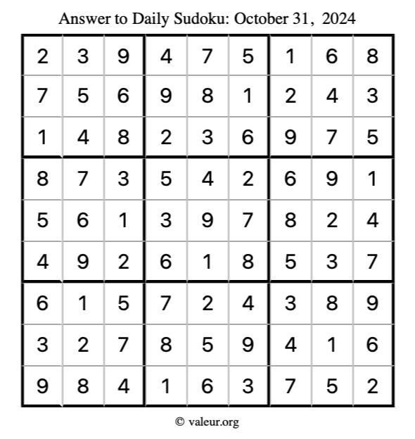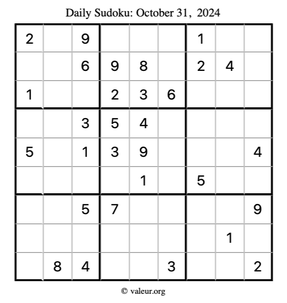 Here is the October 31, 2024 sudoku puzzle. You are welcome to print a copy to solve by hand. For your convenience, we have also included the solution further down the page so you can check your work.