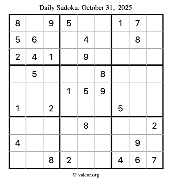 Here is the October 31, 2025 sudoku puzzle. You are welcome to print a copy to solve by hand. For your convenience, we have also included the solution further down the page so you can check your work.