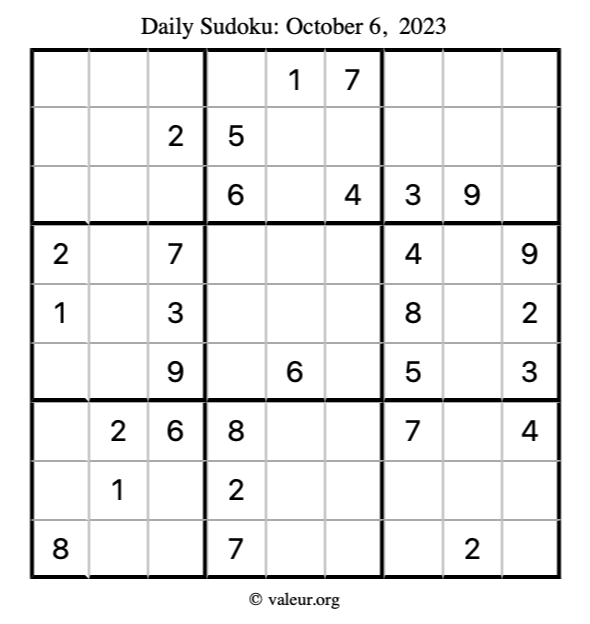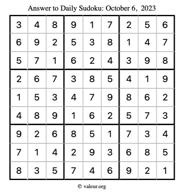 Here is the October 6, 2023 sudoku puzzle. You are welcome to print a copy to solve by hand. For your convenience, we have also included the solution further down the page so you can check your work.