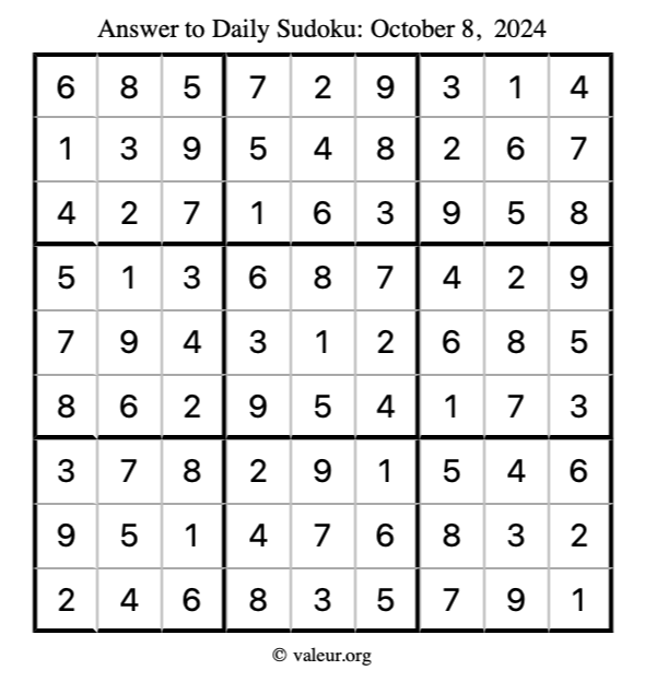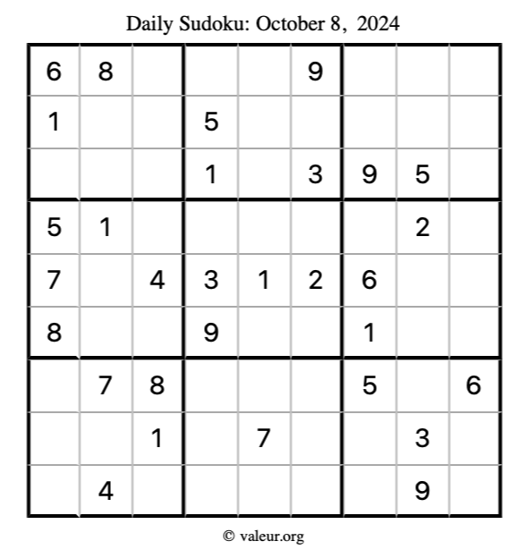 Here is the October 8, 2024 sudoku puzzle. You are welcome to print a copy to solve by hand. For your convenience, we have also included the solution further down the page so you can check your work.